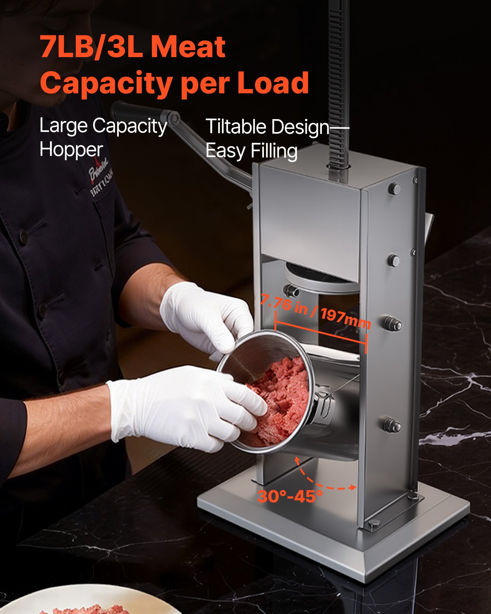Generous Capacity: The tilting barrel of this meat stuffer can hold up to 7 lbs / 3 L of meat. Ideal for producing larger batches at once, it reduces the need for constant refilling. The barrel, tubes, frame, and base are all crafted from stainless steel for long-lasting, rust-resistant use