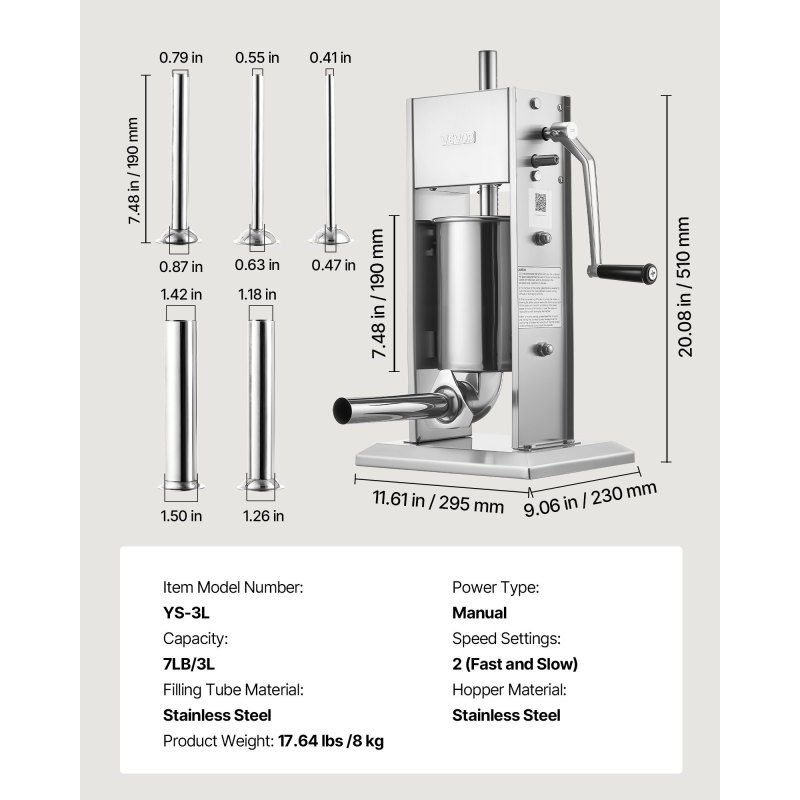 Multiple Tube Sizes: This vertical sausage stuffer comes with five premium stuffing tubes: ⌀0.47(0.41) in, ⌀0.63(0.55) in, ⌀0.87(0.79) in, ⌀1.26(1.18) in, and ⌀1.50(1.42) in. All components that contact food are smooth, burr-free, and comply with food-grade standards