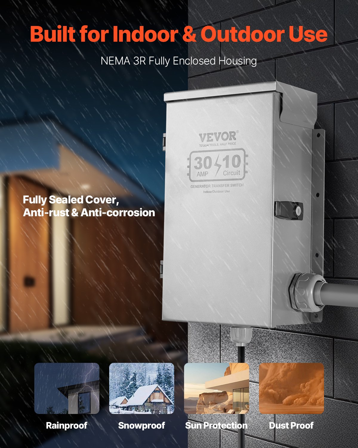 Indoor and Outdoor Use: The NEMA 3R weatherproof enclosure with a fully enclosed cover ensures secure use even in harsh conditions like rain, snow, intense sunlight, or dust storms. Our generator transfer switch kit keeps the internal wiring protected for reliable operation