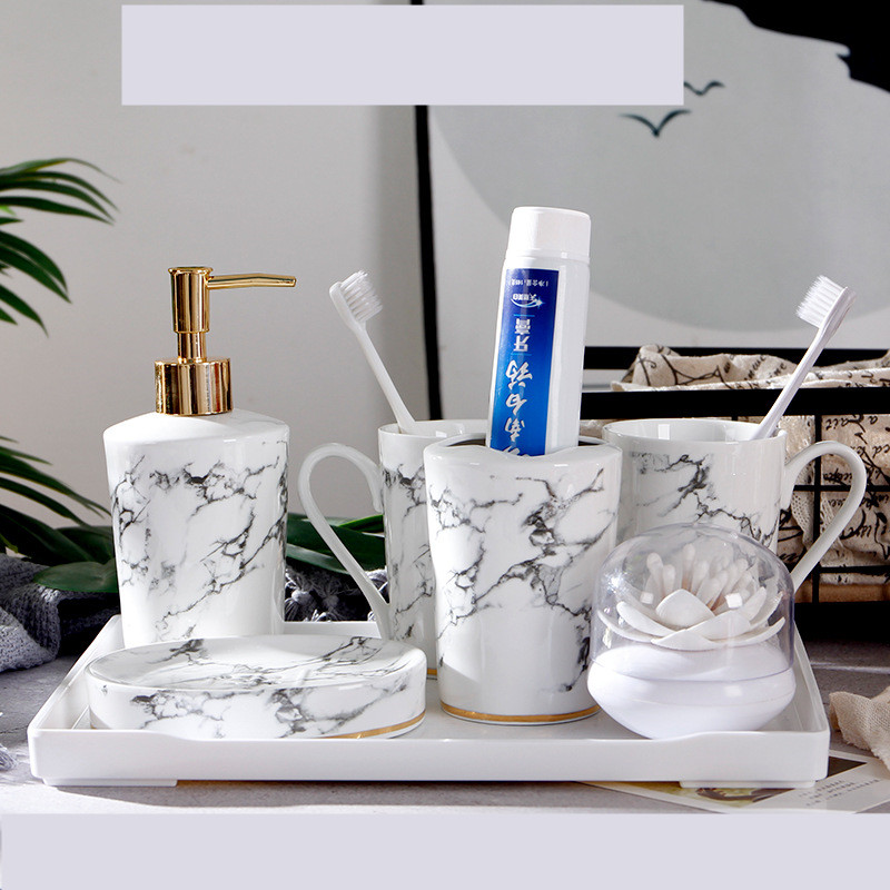 Specification:Five piece set(Lotion bottle 1 toothbrush bottle 1 mouthwash cup 2 soap box 1 cotton swab box),Six-piece suit(Lotion bottle 1 toothbrush bottle 1 mouthwash cup 2 soap box 1 cotton swab box 1 tray)