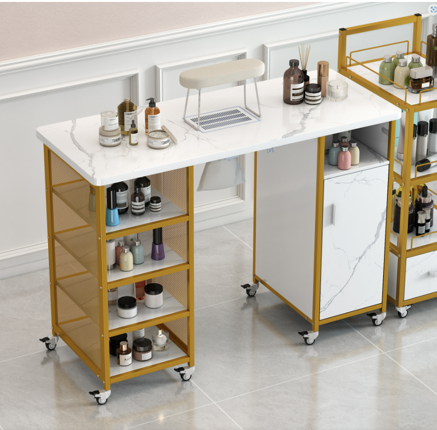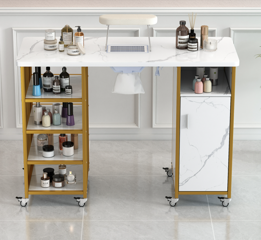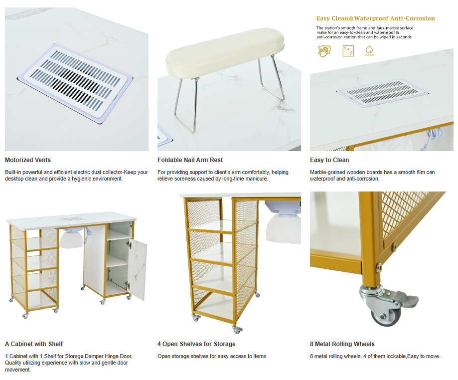 Product Name:Manicure Table, Marbling Texture Nail Table with Electric Downdraft Vent,Wrist Cushion, Lockable Wheels, Storage layers & cabinet,White