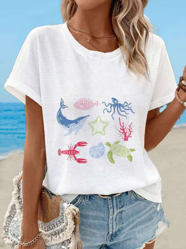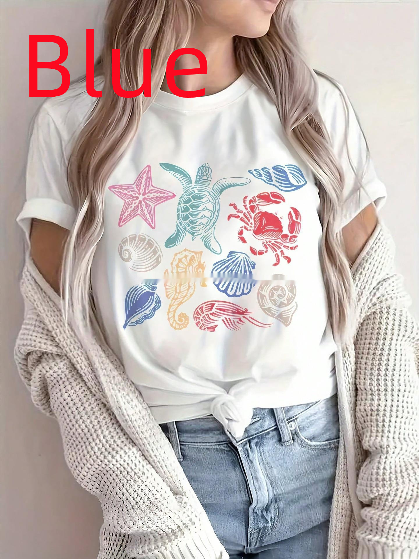 Marine Life Turtle Shell Breathable Printed Crew Neck Short Sleeve T Shirt Top