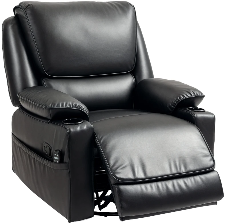 Features: - Eight vibrating massage points effectively soothe tired muscles - Five massage modes with lumbar heating, controlled by a remote for enhanced relaxation - Side tab allows upright or 150 degrees reclining positions - Rocking and 360-degree swivel for versatile comfort - Oversized design with thick cushions offers extra comfort - Overstuffed seat with spring pocket for stretchy comfort - Two side pockets and two cup holders increase functionality Easy to assemble. Specification: - Color: Black - Materials: PU (100% Polyurethane), Foam, Steel - Upright Dimension: 33.5" W x 39" D x 40.6" H - Reclined Dimension: 33.5" W x 63.8" D x 32.3" H - Seat Size: 22" W x 20.5" D x 19.3" H - Back Size: 26.8" L x 32.3" W x 9.8" D - Armrest Size: 29.1" L x 9.8" W x 5.9" H - Pocket Size: 29.1" W x 11.4" H - Power Cord Length: 5.9' - Cup Holder Size: 4.3" Dia. x 2.6" D - Input: 100-240V 50/60Hz - Output: 12V, 1A, 12W - Weight Capacity: 298 lbs. Package Includes: - 1 x Massage Recliner Chair - 1 x Remote - 1 x Manual