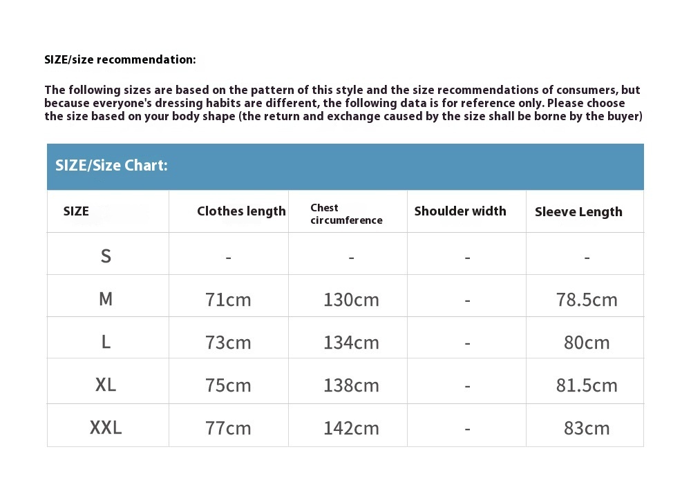 1. Asian sizes are 1 to 2 sizes smaller than European and American people. Choose the larger size if your size between two sizes. Please allow 2-3cm differences due to manual measurement. 2. Please check the size chart carefully before you buy the item, if you don't know how to choose size, please contact our customer service. 3.As you know, the different computers display colors differently, the color of the actual item may vary slightly from the following images.