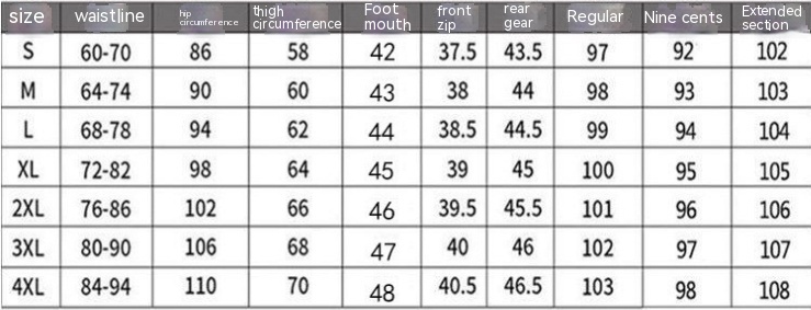 Size: S 42.50 kg-47.50 kg, M 47.50 kg-54.00 kg, L 54.00 kg-60.00 kg, XL 60.00 kg-65.00 kg, 2XL 65.00 kg-72.50 kg, 3XL 72.50 kg-80.00 kg, 4XL 80.00 kg-87.50 kg