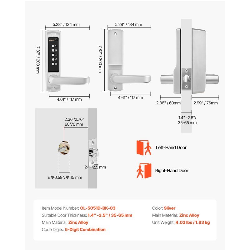 Fits More Door Types: This mechanical keyless entry door lock comes with 4 spindles (fits 1.4"-2.5"/35-65mm door thicknesses) and 2 latch sizes (2.3"/60mm & 2.7"/70mm) for varied door depths. The lock can be mounted on both left-hand and right-hand doors