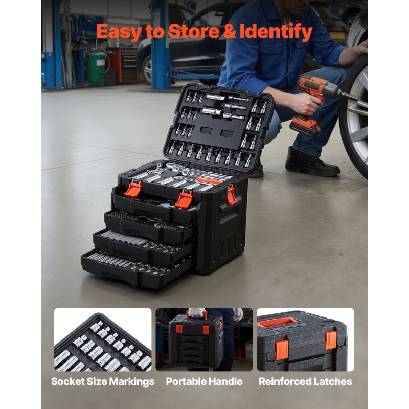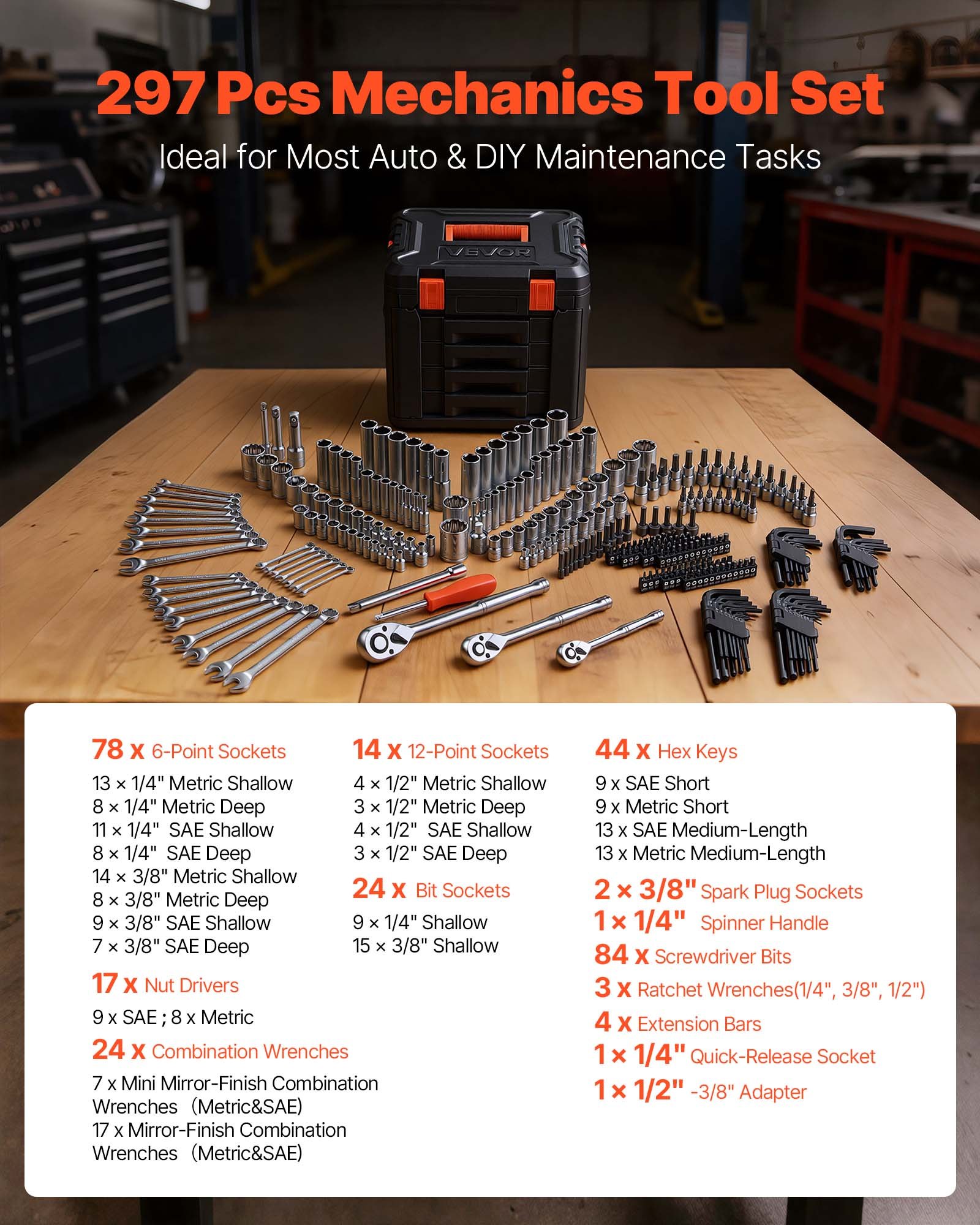 All-in-One Tool Set: This 297-piece mechanic tool kit brings together essential tools for automotive repair, home improvement, plumbing work, and DIY projects—all in one versatile kit