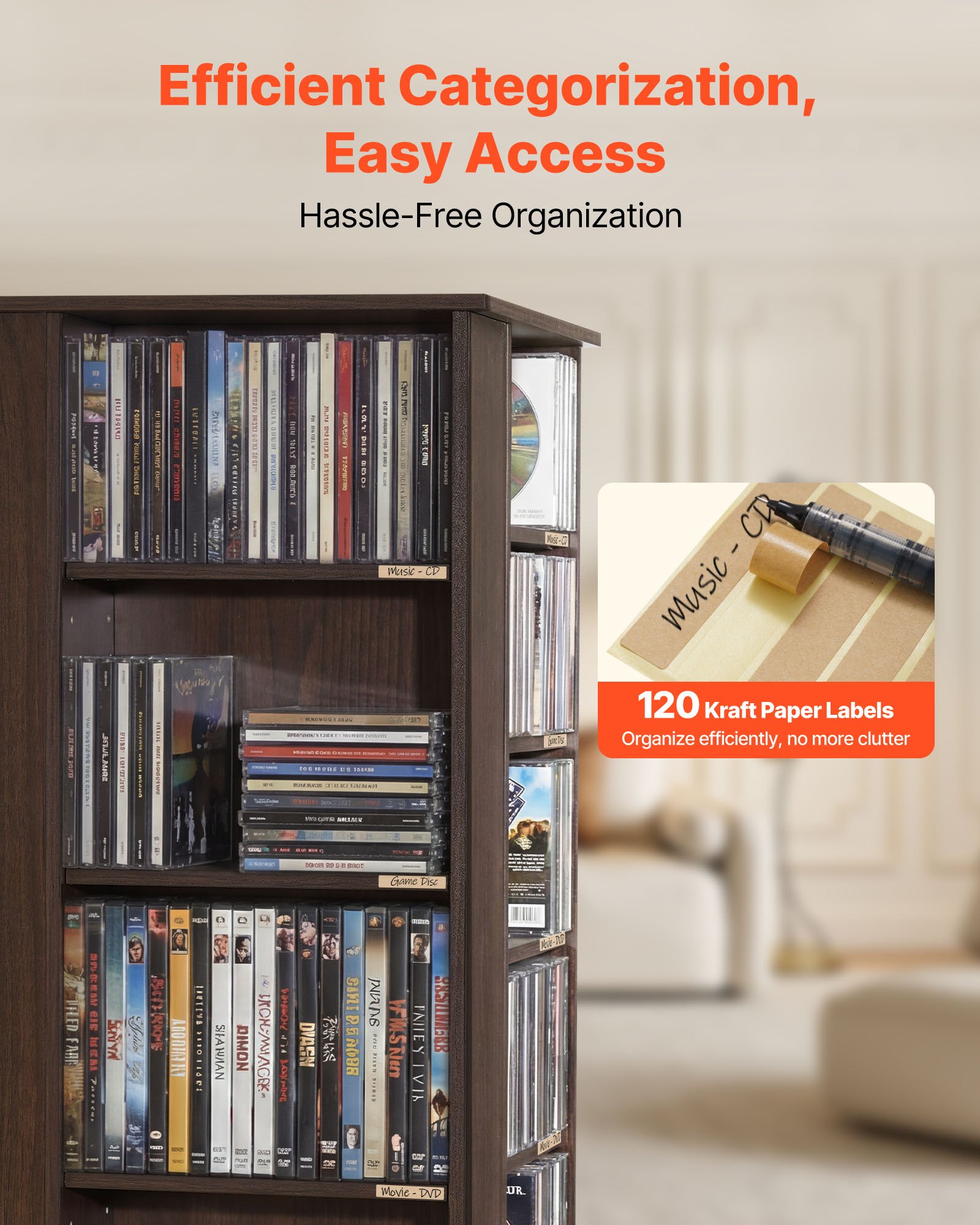 Clear & Organized Storage: This CD cabinet includes kraft paper labeling stickers, so you can mark each compartment your way. Easily sort and identify collectibles at a glance, keeping your media collection neatly organized at all times