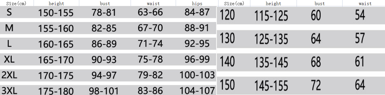 Sizes S, M, L, XL, XXL, XXXL, Children 120, Children 130, Children 140, Children 150
