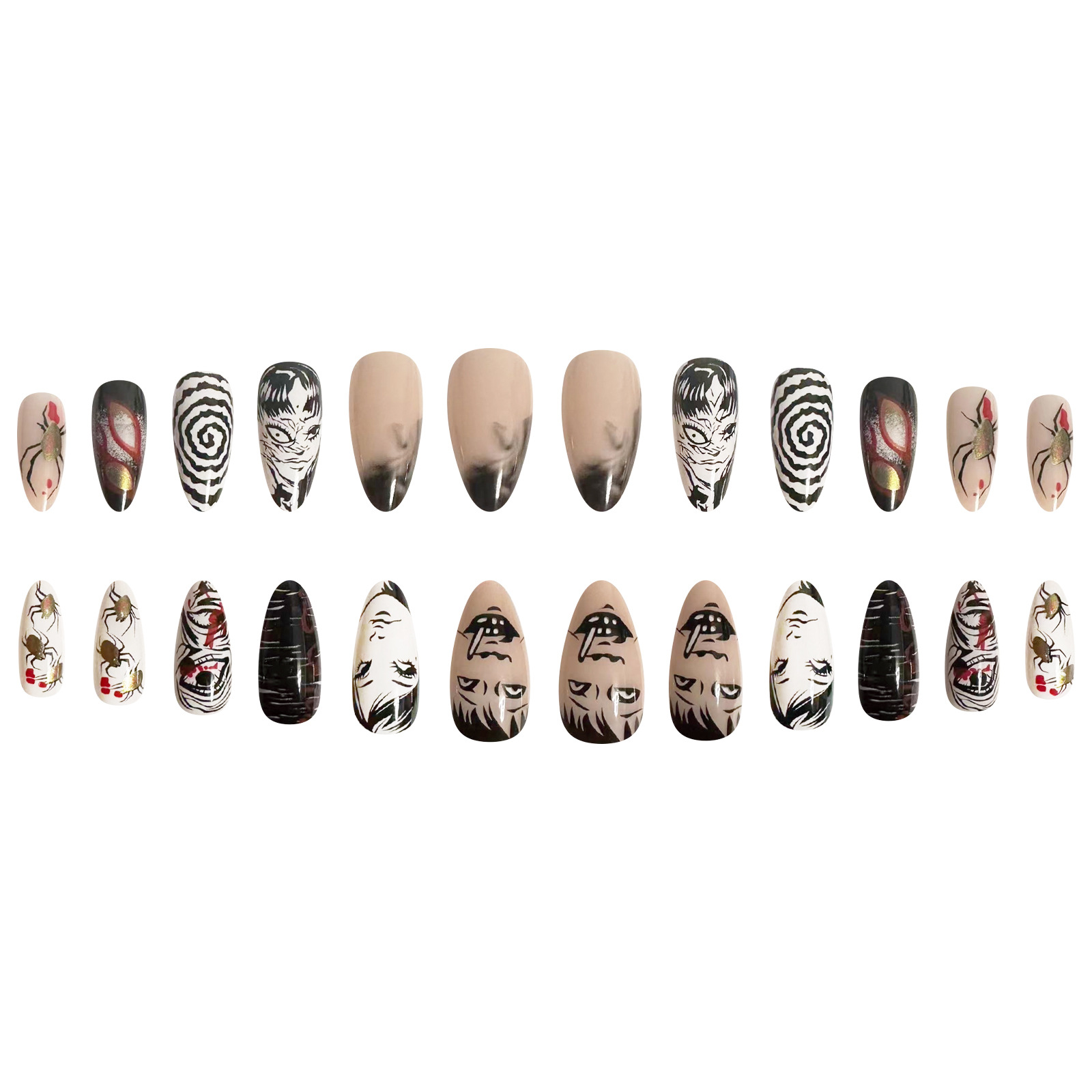 Color: XR-16, Japanese style two-dimensional black and white horror cartoon design medium almond wear armor nail stickers foreign trade fake nails
