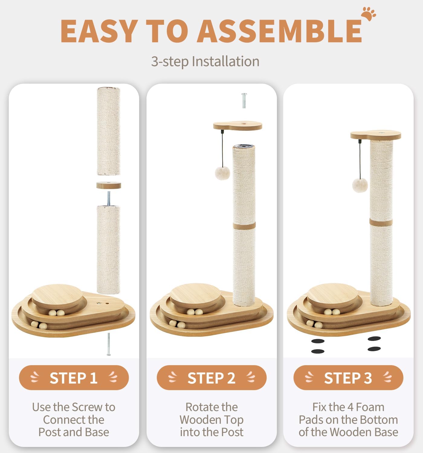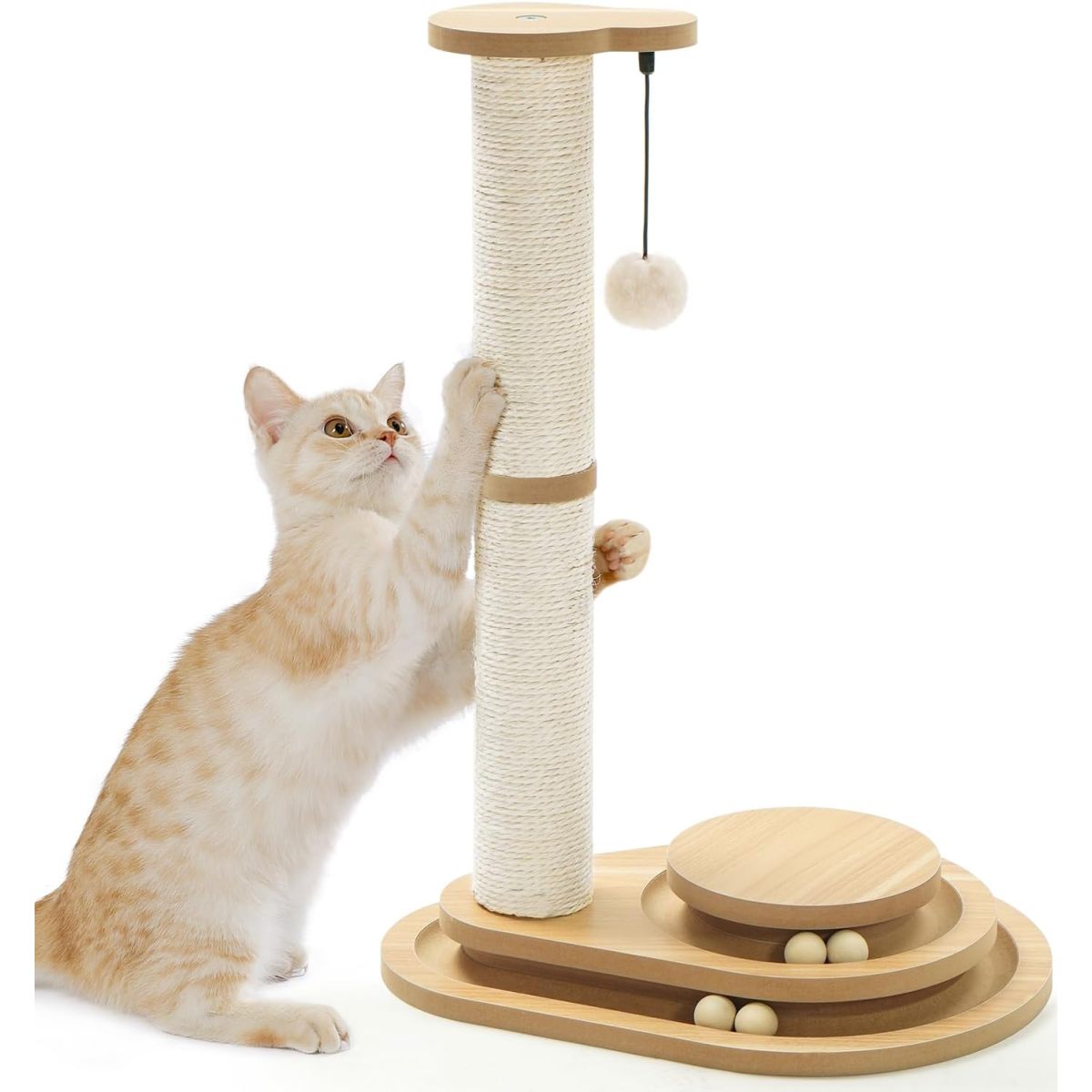 [Cat Scratching Post]:This interactive cat scratcher is a combination of cat scratching post and cat toys and it features with a flush ball on the top, 1 sisal scratching post for climbing and sharpening cat claws and 4 playballs to exercise cats’ instinct of catching. This scratcher engages small kittens and adult cats in multiple levels of play, making it both useful and amusing! [3-Tier Cat Toy Board]:The cat scratchers pole is designed with 3 levels of tracks and 4 moving balls to attract kitty’s attention! Your cat will adore batting, swatting, and pouncing the playing balls as they entertain their natural instincts to hunt. [Natural Sisal Rope & Sturdy Base ]: Cat Pole is made of 100% natural sisal to satisfy your cats’ natural instinct of scratching. The bottom base is made of heavy chipboard, safe and stable, avoid tipping and shaking, also provide reliability and stability while kitten playing the balls. [Keep Your Furnitures Free From Kitty Claws]:Preserve your expensive furniture and home furnishings by giving your cat the right toy to scratch, claw, pull and tear at will. [Easy Installation, Tools Included]:With clear instructions and all the necessary tools, it only takes you a few minutes to complete the assembly; your cats can enjoy these cat scratchers for indoor cats right away.