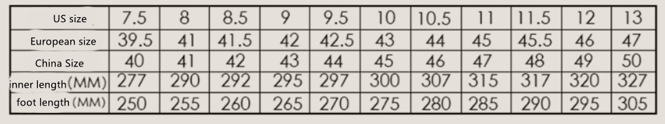 Size: US 7 (Europe 40), US 8 (Europe 41), US 9 (Europe 42), US 10 (Europe 43), US 11 (Europe 44), US 12 (European code 45), US code 13 (European code 46), US code 7.5, US code 10.5, 11.5, US code 8.5
