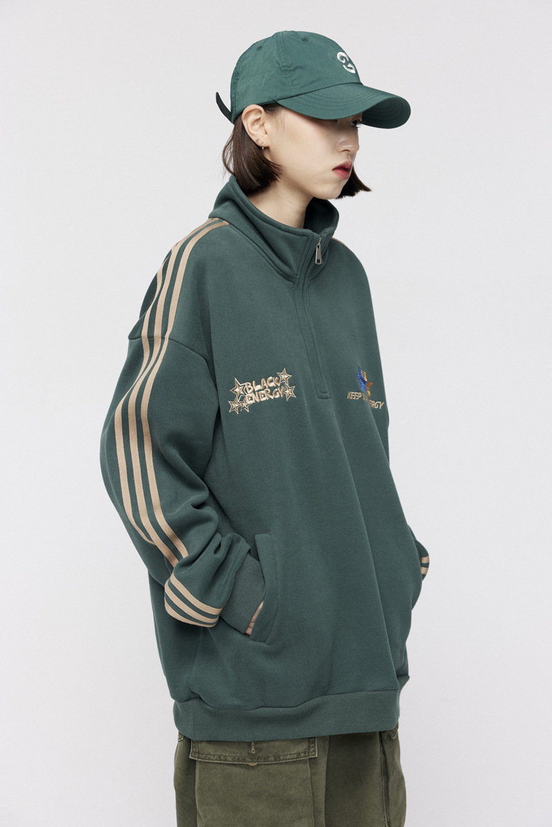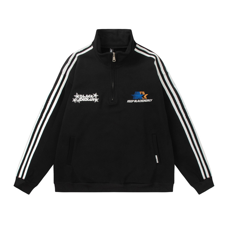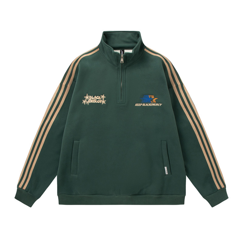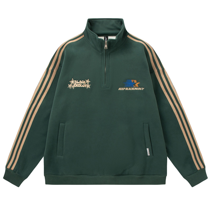 Men's American-style Retro Street Striped With Fleece Lining Half Zipper Jacket