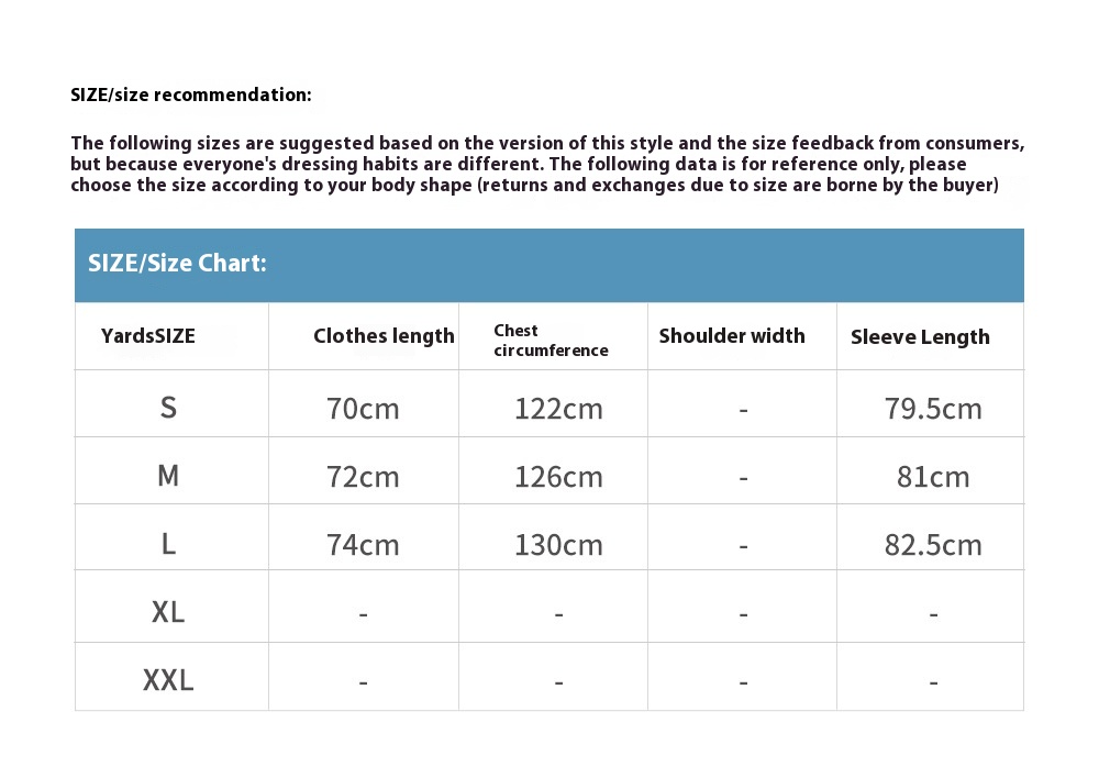 Note: 1. Asian sizes are 1 to 2 sizes smaller than European and American people. Choose the larger size if your size between two sizes. Please allow 2-3cm differences due to manual measurement. 2. Please check the size chart carefully before you buy the item, if you don't know how to choose size, please contact our customer service. 3.As you know, the different computers display colors differently, the color of the actual item may vary slightly from the following images.