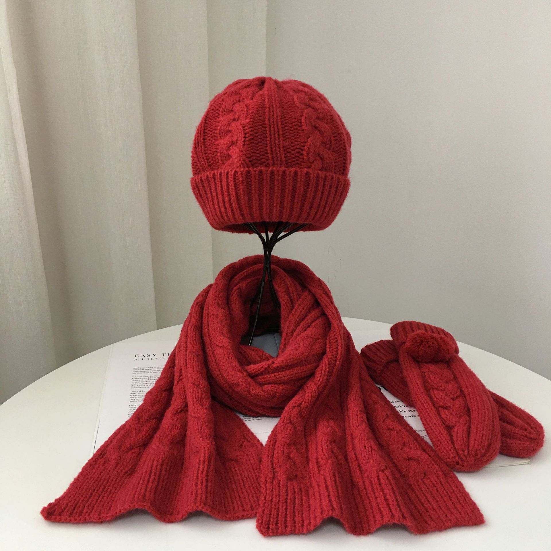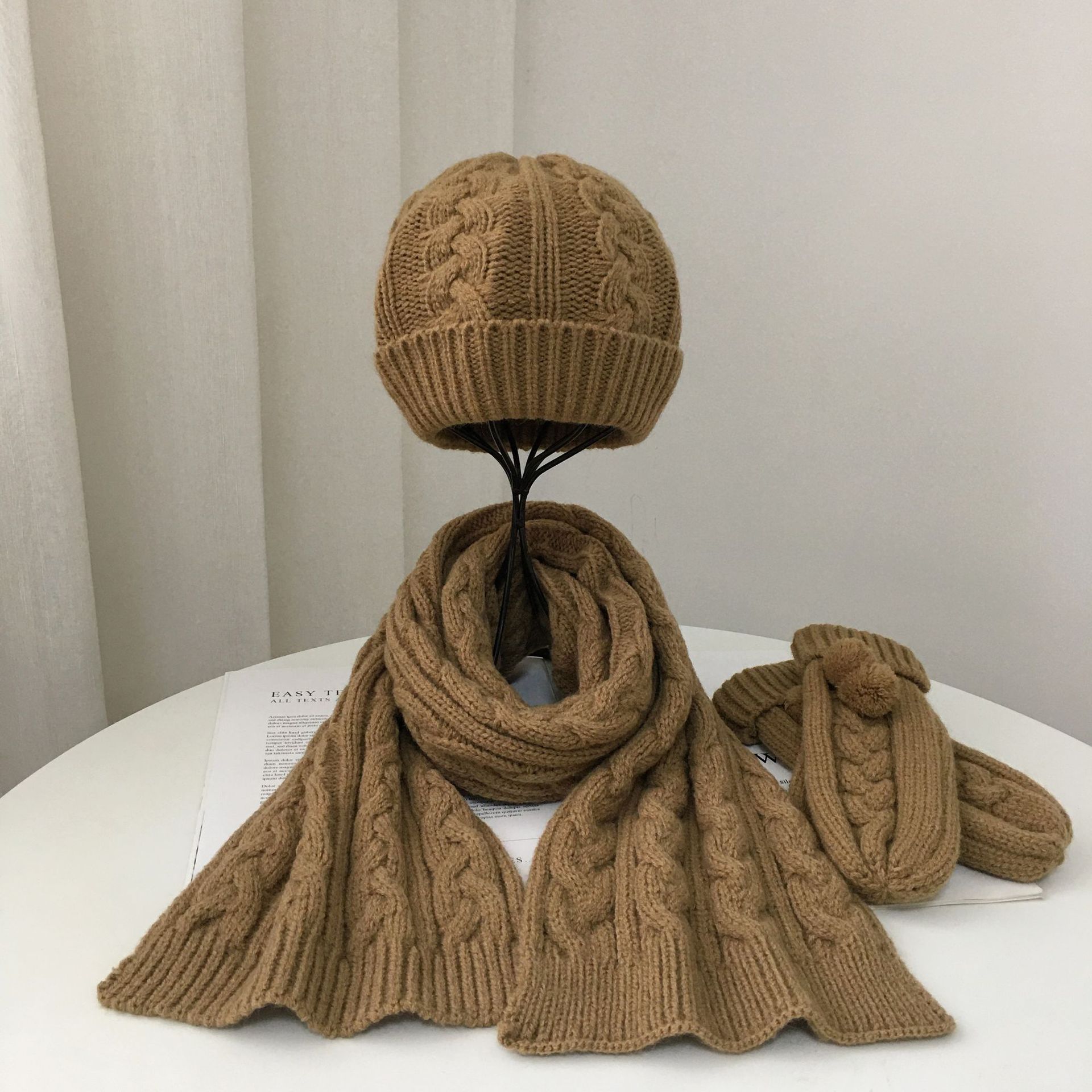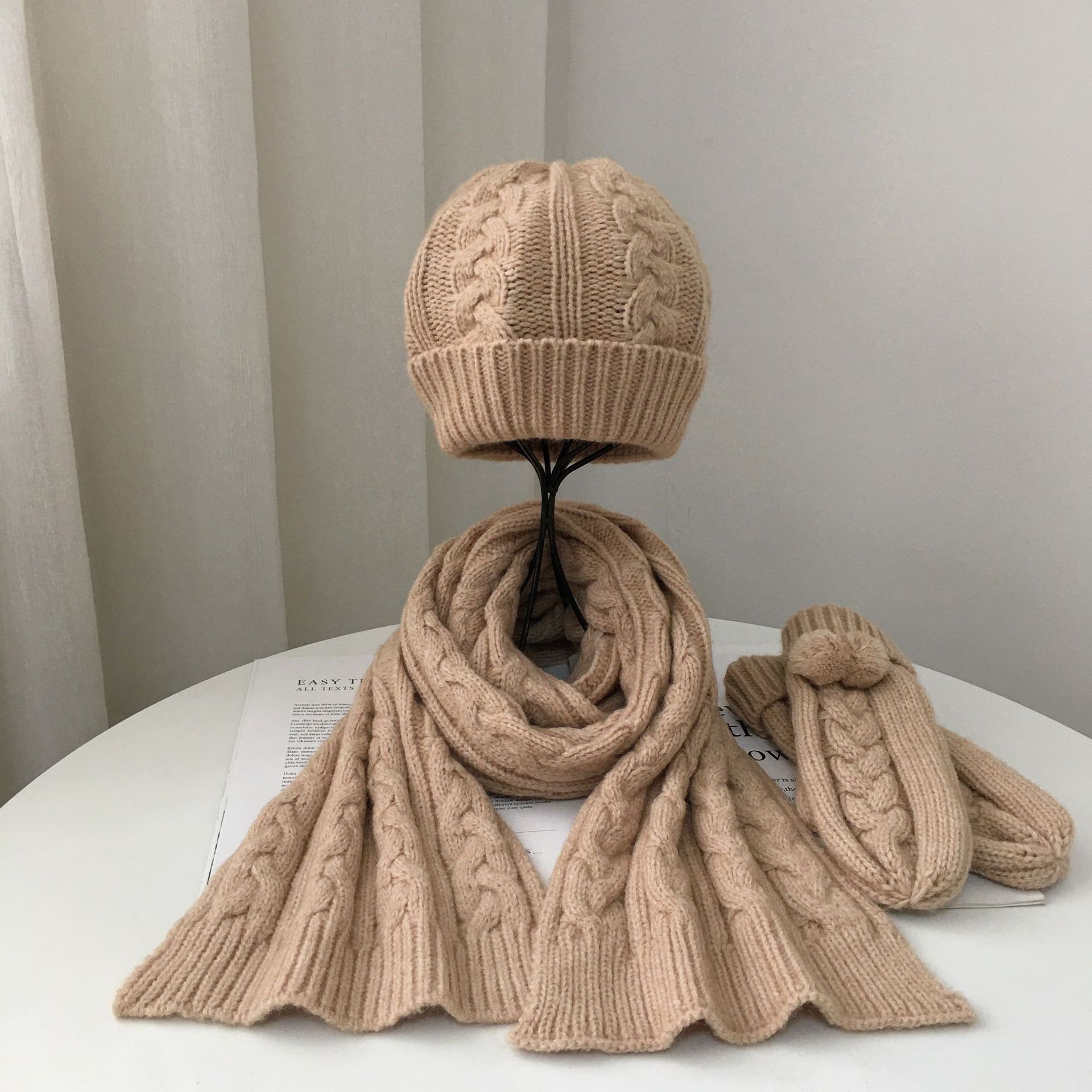 Product size: scarf 170*21cm, hat 19*19+6cm, gloves 22*8. 5cm