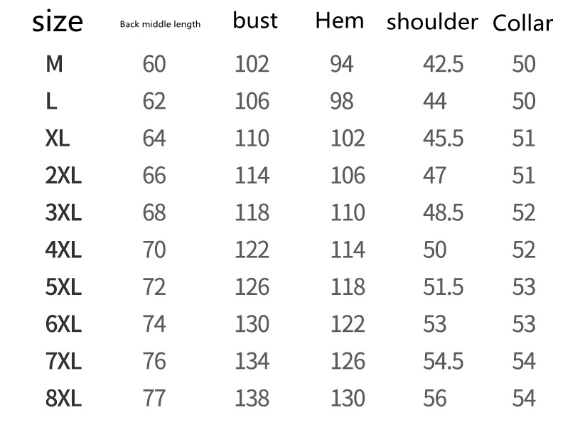 Size: M/L/XL/XXL/3XL/4XL/5XL/6XL/7XL/8XL