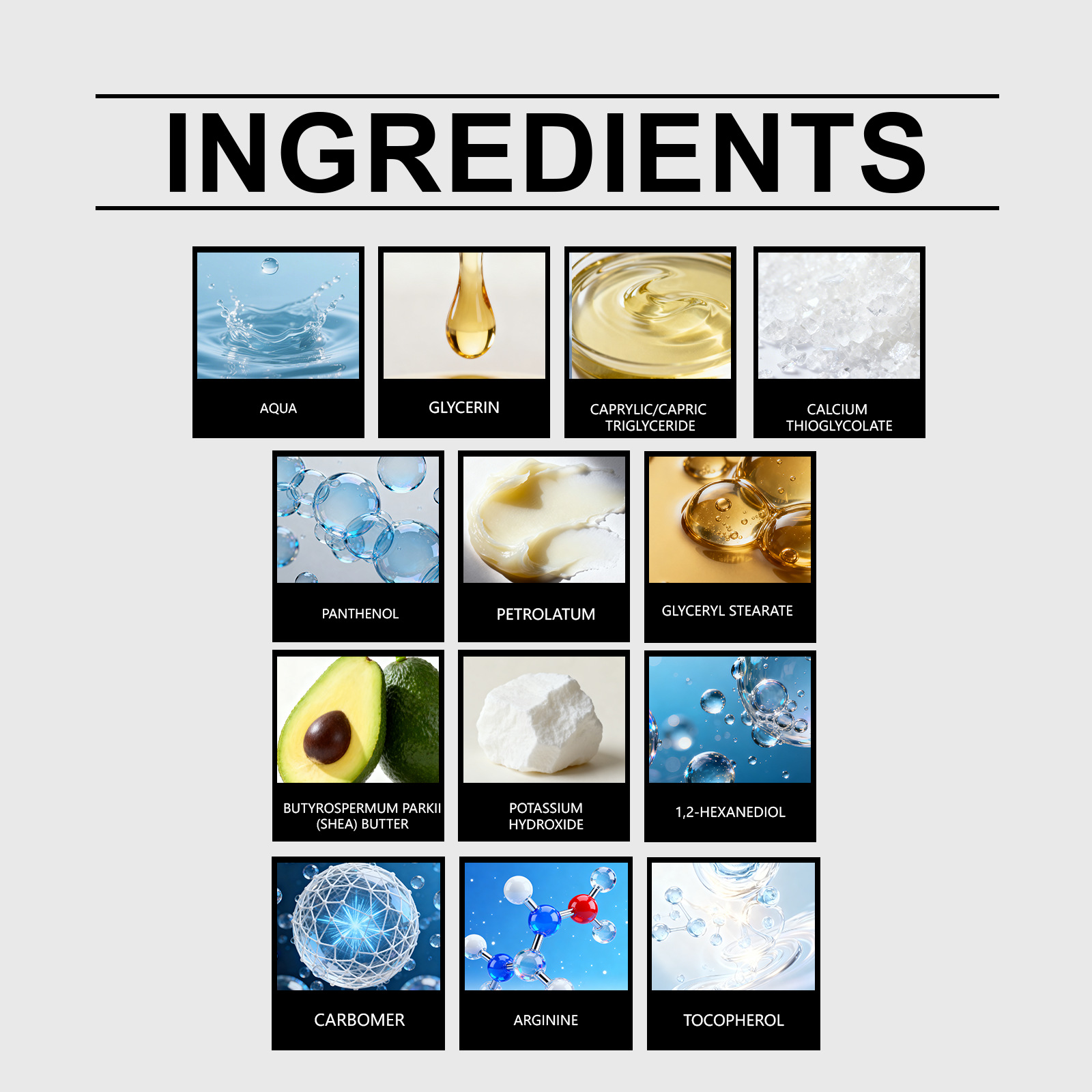 Ingredients: water, glycerol, caprylic/capric triglyceride, calcium thioacetate, panthenol, petrolatum, glyceryl stearate, shea butter, potassium hydroxide, 1,2-hexanediol, carbomer, arginine and tocopherol (vitamin E).