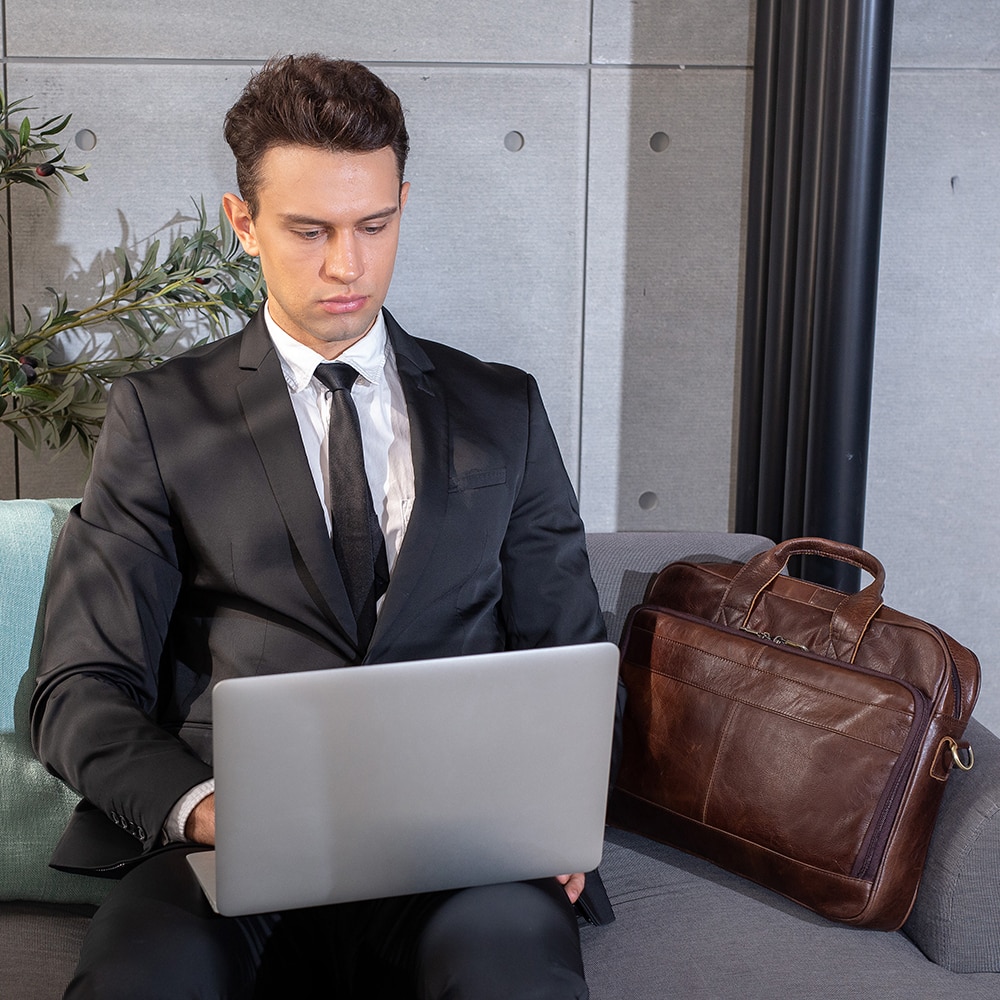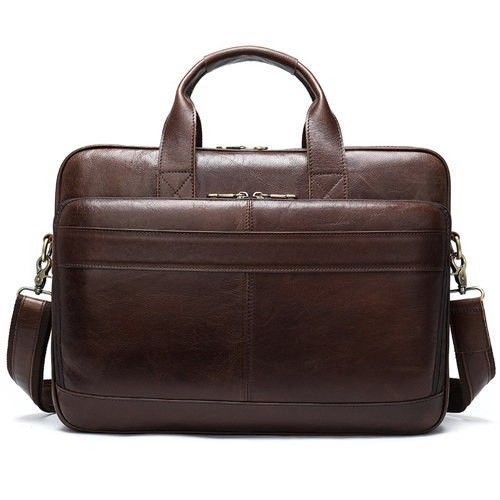 MATERIAL:Genuine LeatherSIZE:40.5cm* 6.5cm* 28cm(L *W*H)COLOR:CoffeeStructure:1 front pocket, 1 main bag (with sandwich), 1 back bag