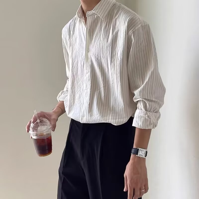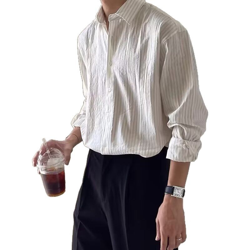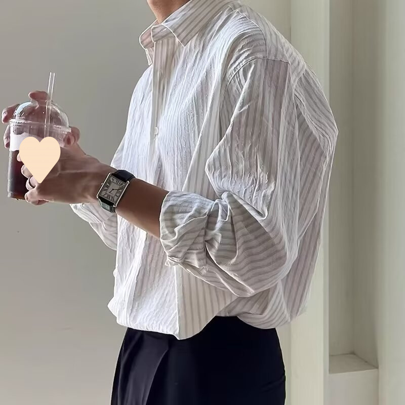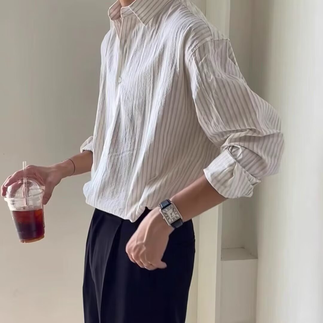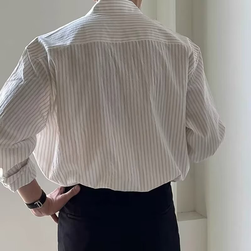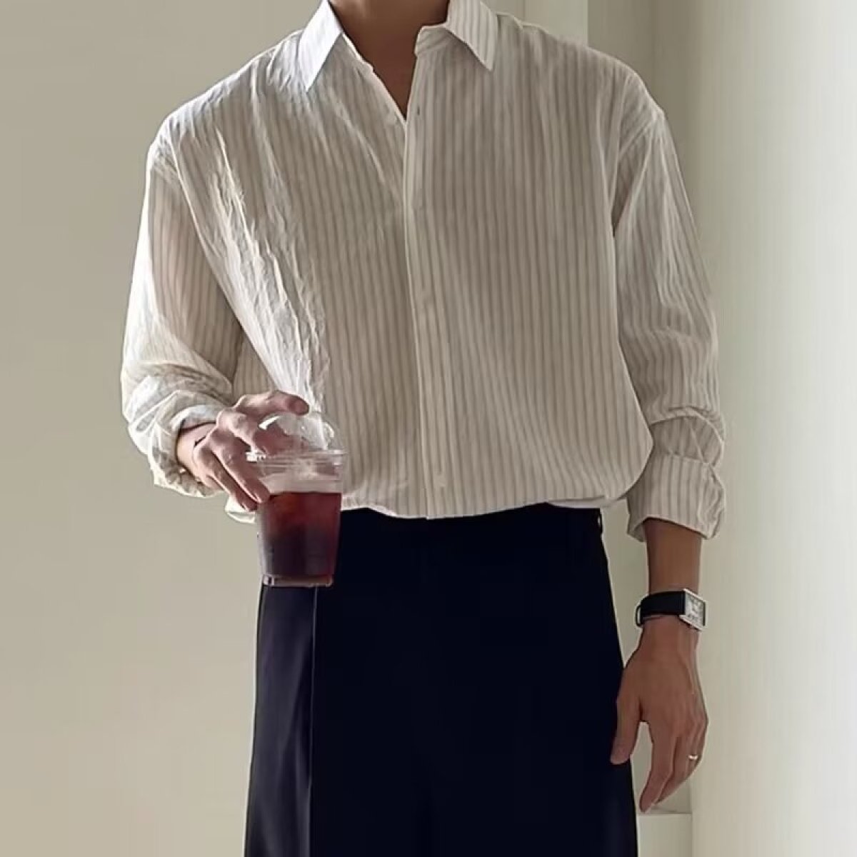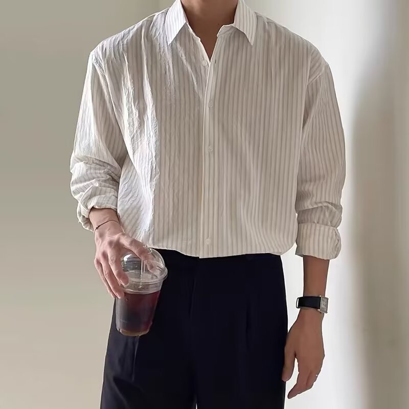 Men's Casual Loose-Fit Long-Sleeve Vertical-Striped Shirt