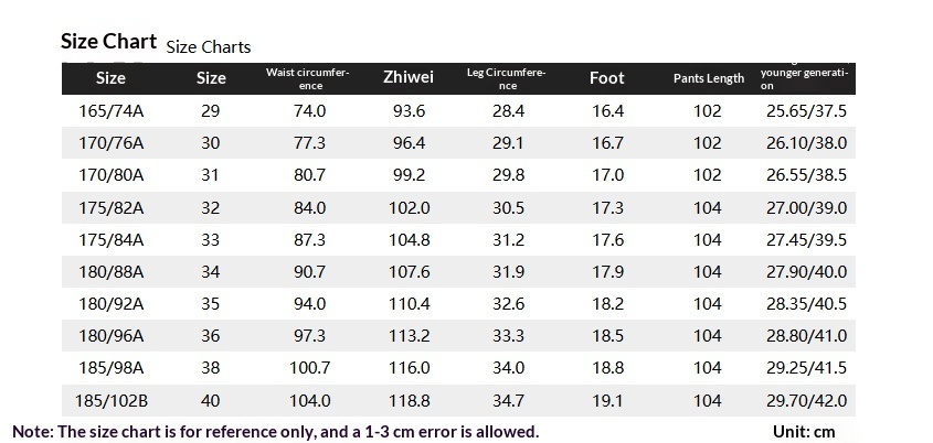 Sizes: 29 (165/74A), 30 (170/76A), 31 (170/80A), 32 (175/82A), 33 (175/84A), 34 (180/88A), 35 (180/92A), 36 (180/96A), 38 (185/98A), 40 (185/102B)