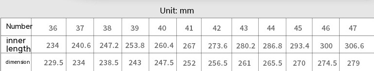Size: 36, 37, 38, 39, 40, 41, 42, 43, 44, 45, 46, 47