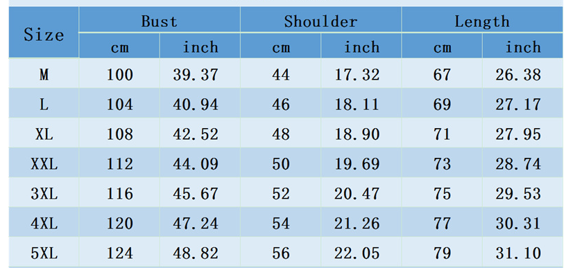 Sizes: M, L, XL, 2XL, 3XL, 4XL, 5XL, 6XL, 7XL, 8XL