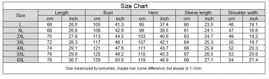 Size L, XL, XXL, 3XL, 4XL, 5XL, 6XL
