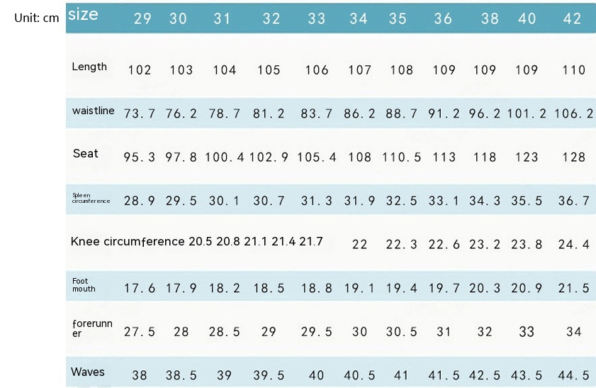 Dimensions: 29(2 feet 2),30(2 feet 3),31(2 feet 4),32(2 feet 5),33(2 feet 6),34(2 feet 7),35(2 feet 8),36(2 feet 9),38(3 feet 1),40(3 feet 4),42(3 feet 3)