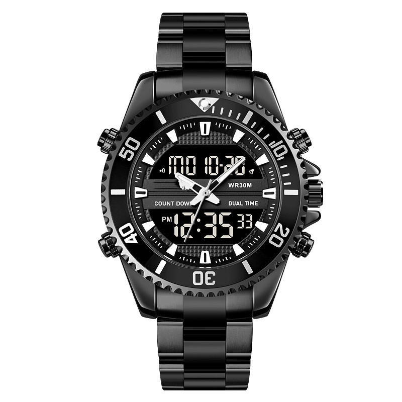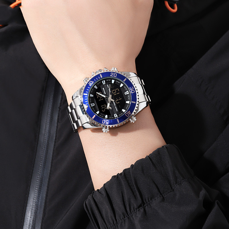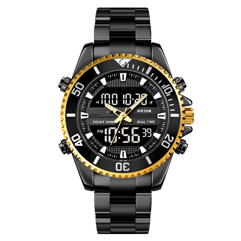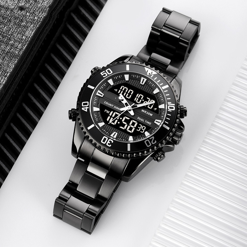 Functions: 3 time, stopwatch chronograph, EL luminous, display date, timer alarm, display day, whole hour chime, countdown timer, 12/24 hour system
