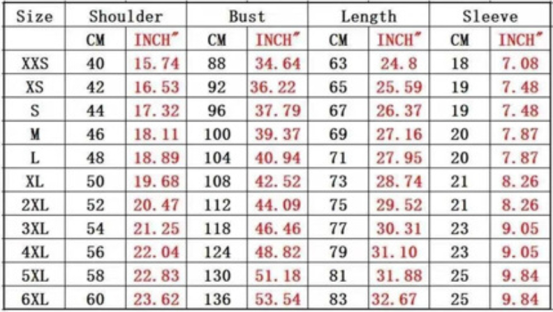 Sizes: S, M, L, XL, 2XL, 3XL, 4XL, 5XL, 6XL