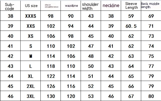 Size: 38/XXXS,39/XXS,40/XS,41/S,42/M,43/L,44/XL,45/XXL,46/XXXL