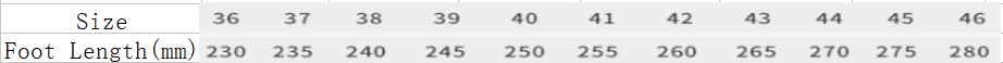 | Foot length | 245 | 250 | 255 | 260 | 265 | 270 |