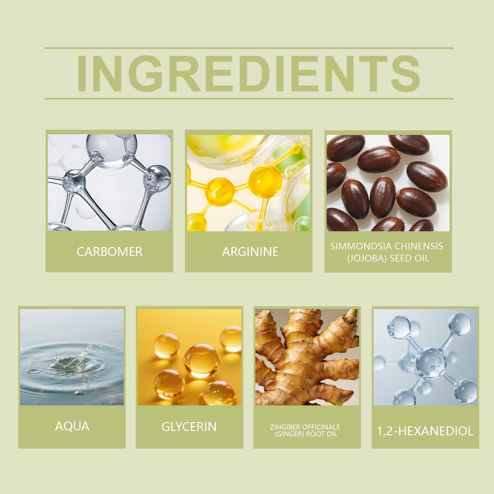 Ingredients: water, glycerin, 1,2- hexanediol, carbomer, arginine, ginger root oil, jojoba seed oil.