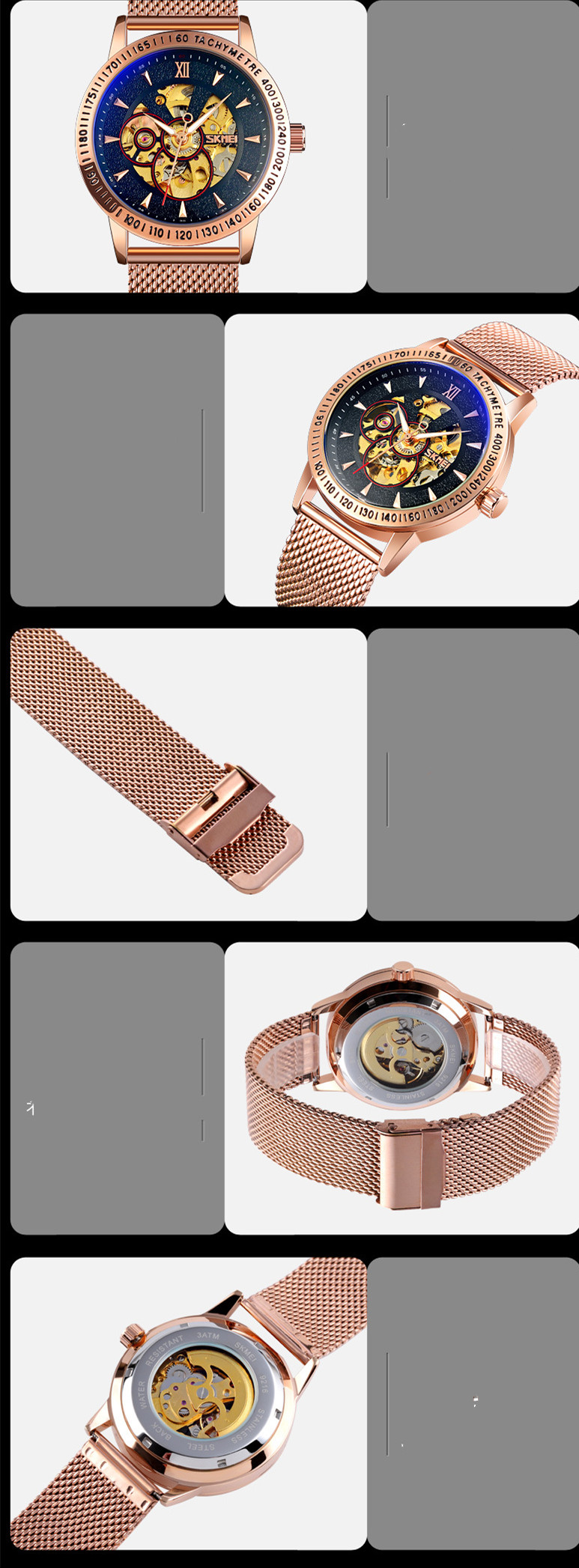 Material: Zinc alloy case, stainless steel strap, high transparent glass mirror, stainless steel + transparent glass bottom cover, stainless steel buckle
