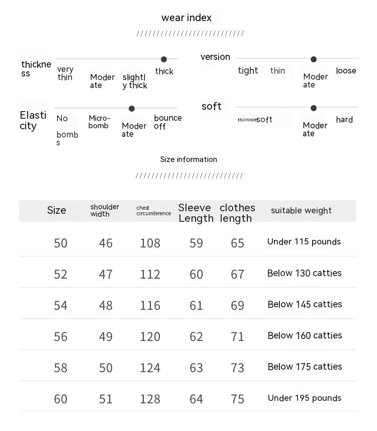 Size: 50/L/47.50kg-57.50kg,52/XL/57.50kg-65.00kg,54/2XL/65.00kg-72.50kg,56/3XL/72.50kg-80.00kg, 58/4XL/80.00kg-87.50kg, 60/5XL/87.50kg-97.50kg
