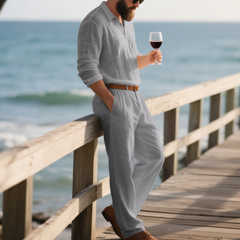 Men's Linen POLO Long-sleeved Trousers Casual Suit Solid Color Two-piece Set