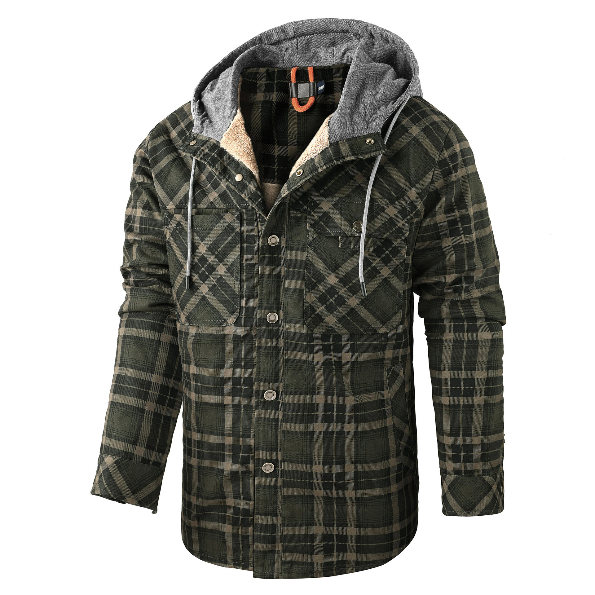 Men's Long-sleeved Fleece-lined Hooded Plaid Shirt Autumn Winter Coat Cotton-padded Jacket