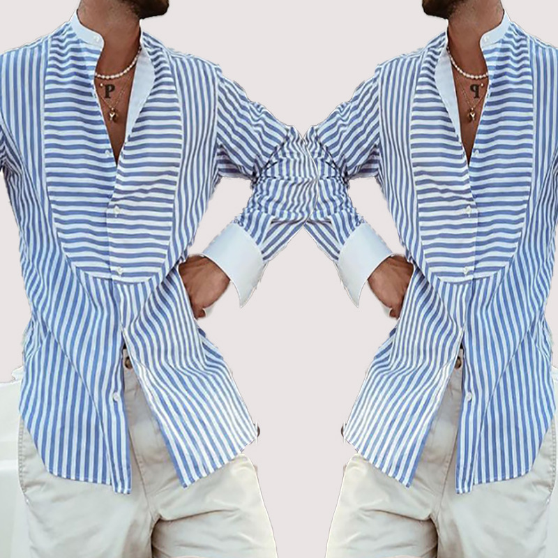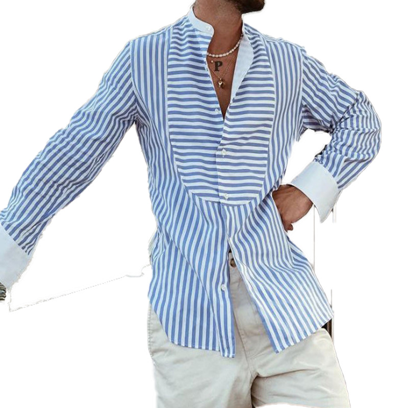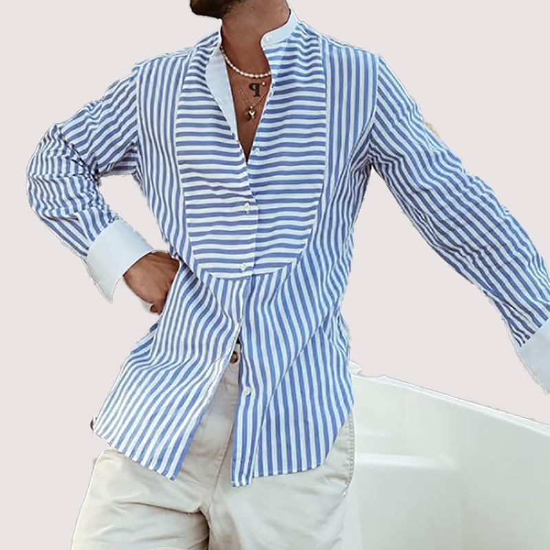 Men's Loose And Simple Striped Irregular Stitching Long-sleeved Shirt Cardigan