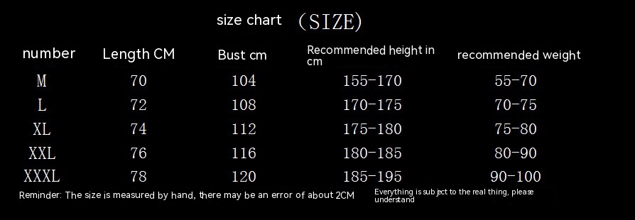 Note: 1. Asian sizes are 1 to 2 sizes smaller than European and American people. Choose the larger size if your size between two sizes. Please allow 2-3cm differences due to manual measurement. 2. Please check the size chart carefully before you buy the item, if you don't know how to choose size, please contact our customer service. 3.As you know, the different computers display colors differently, the color of the actual item may vary slightly from the following images.