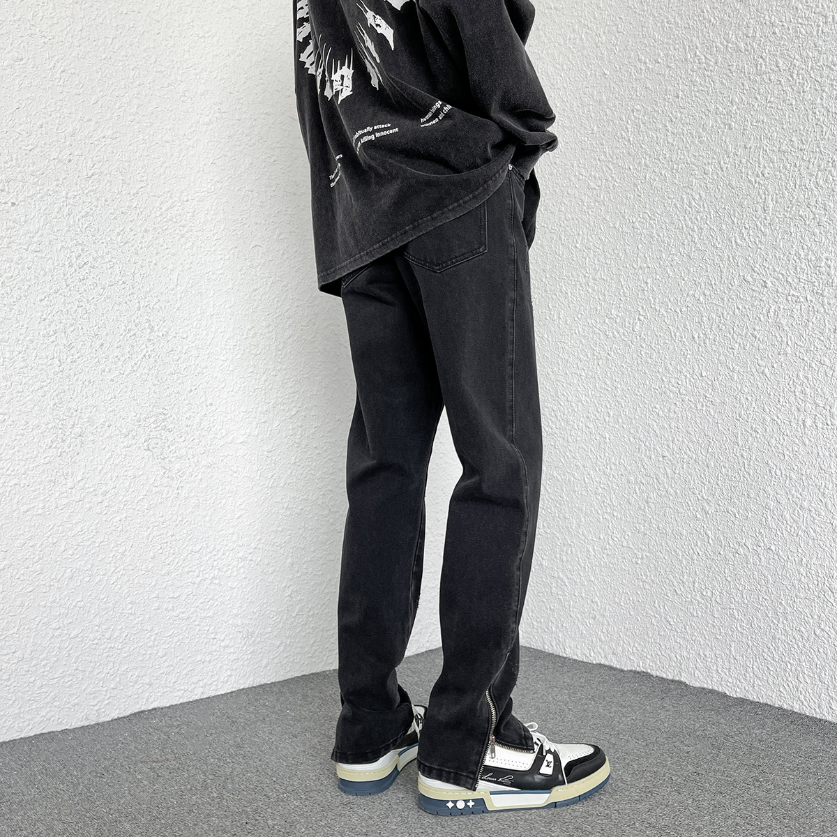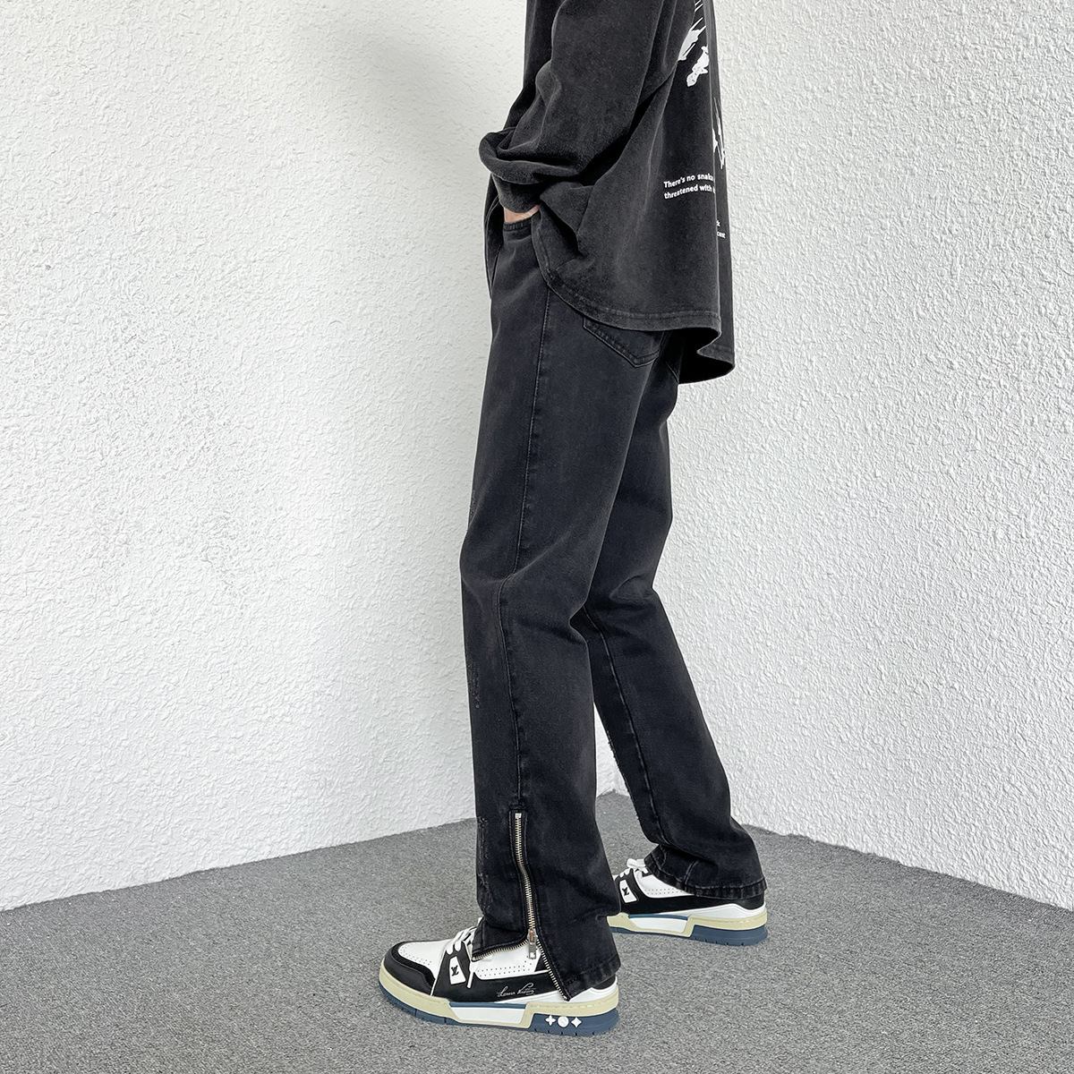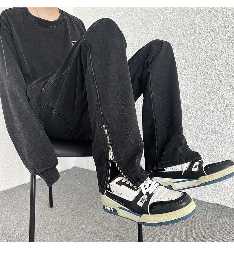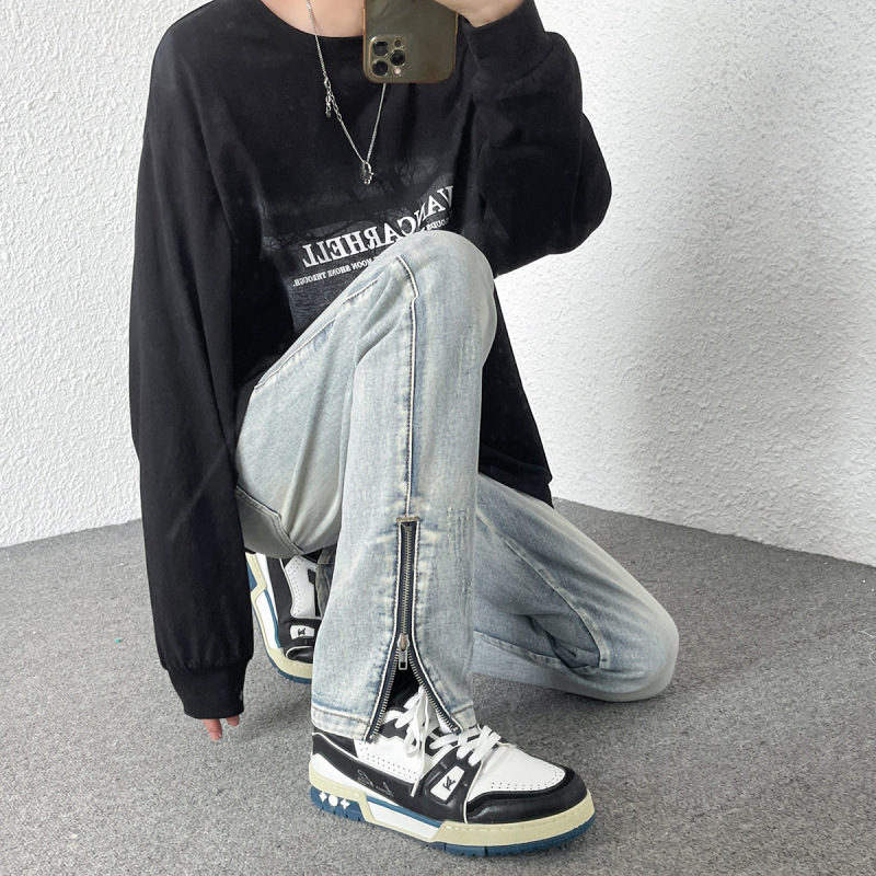 Men's Loose Straight Zipper Design Hong Kong Style Casual Jeans