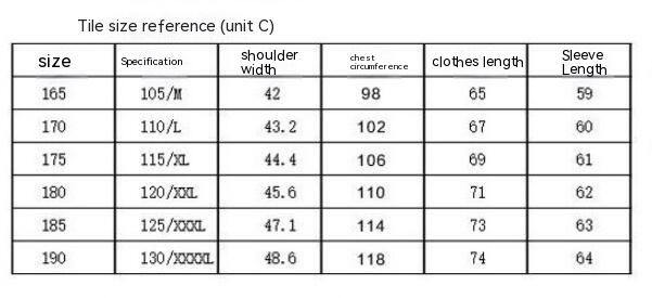 Size: 165/M (recommended 45.00kg-55.00kg,170/L (recommended 55.00kg-65.00kg,175/XL (recommended 65.00kg-72.50kg,180/XXL (recommended 72.50kg-80.00kg,185/3XL (recommended 80.00kg-90.00kg,190/4XL (recommended 90.00kg-100.00kg)