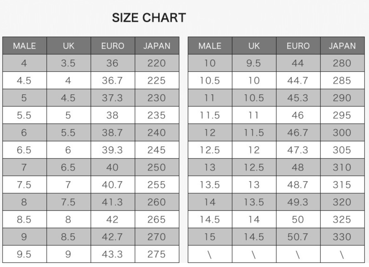Sizes: 38, 39, 40, 41, 42, 43, 44, 45, 46, 47, 48