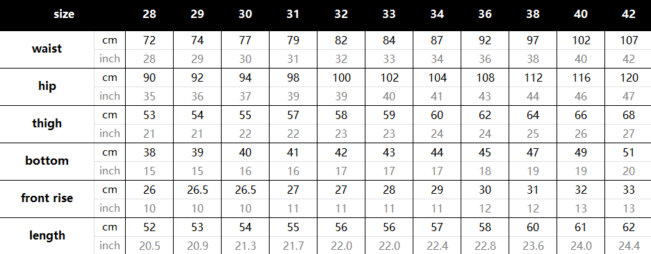 Size: 28, 29, 30, 31, 32, 33, 34, 36, 38, 40, 42