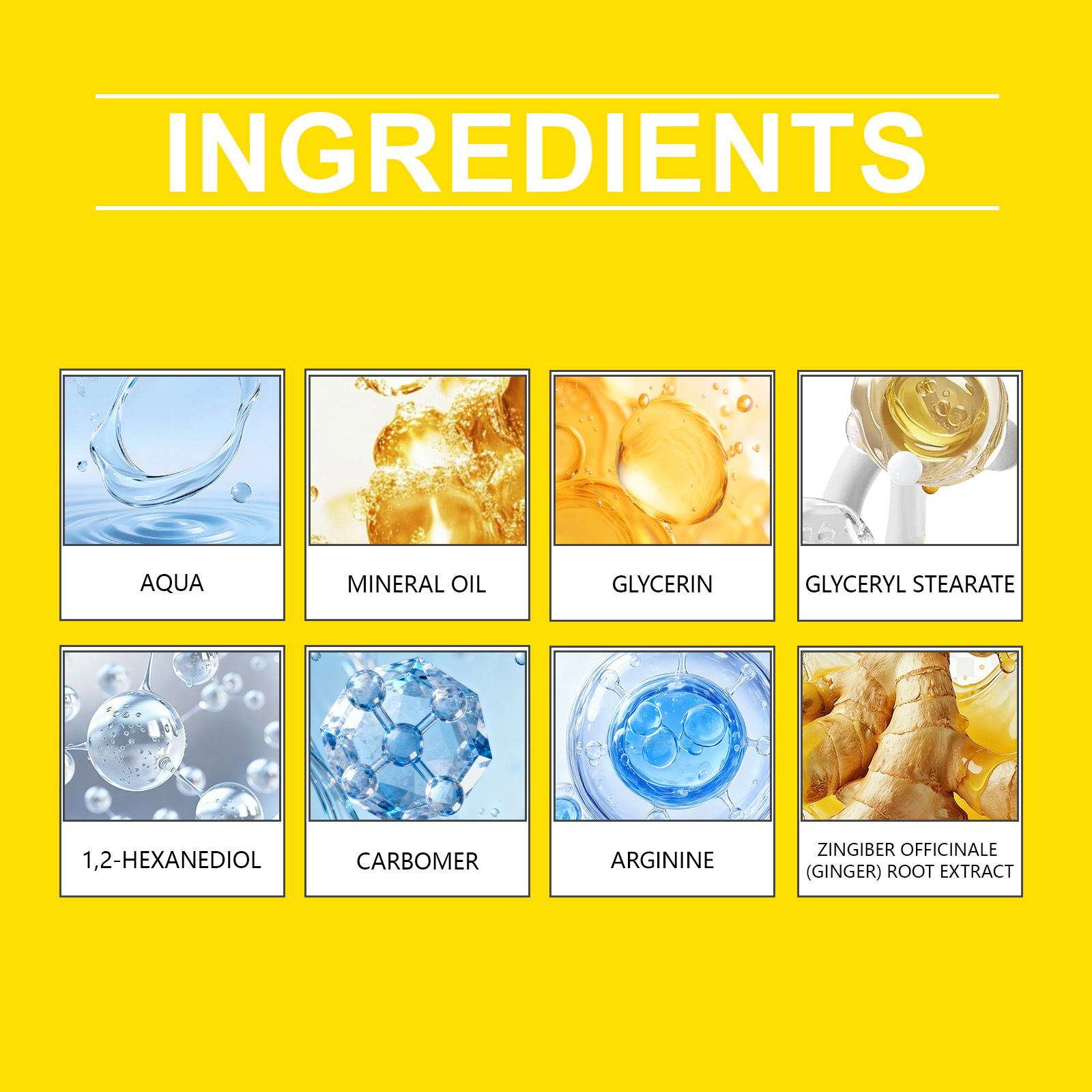 Ingredients: water, mineral oil, glycerin, glycerol stearate, 1,2- hexanediol, carbomer, arginine and ginger root extract.