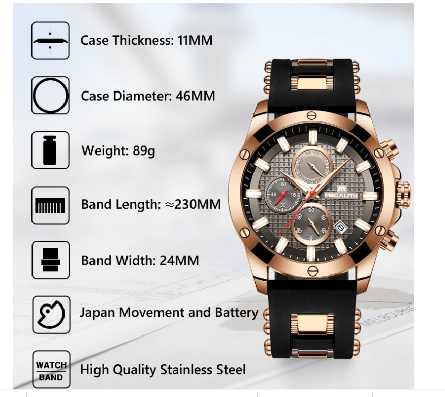Brand: magalithApplicable population: MaleStyle: LeisureWaterproof performance: 30mMovement type: Quartz