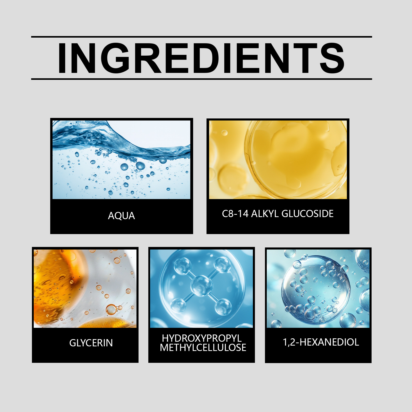 Product information:Ingredients: water, C8-14 alkyl glucoside, glycerol, hydroxypropyl methylcellulose, 1,2-hexanediol.