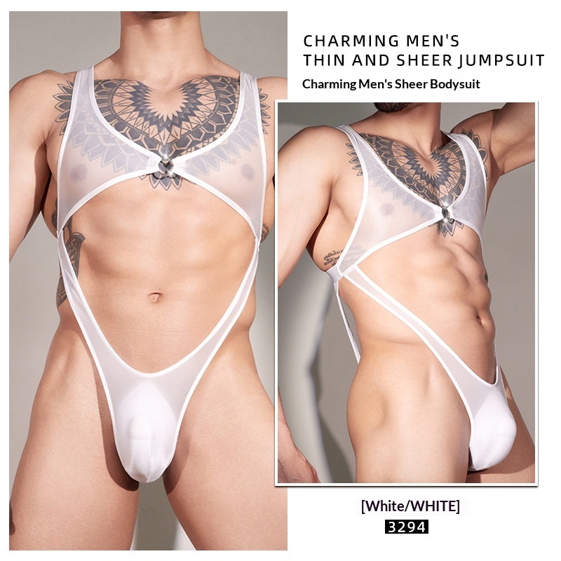 Mens Sheer Silky Hollow-out Sexy Bodysuit