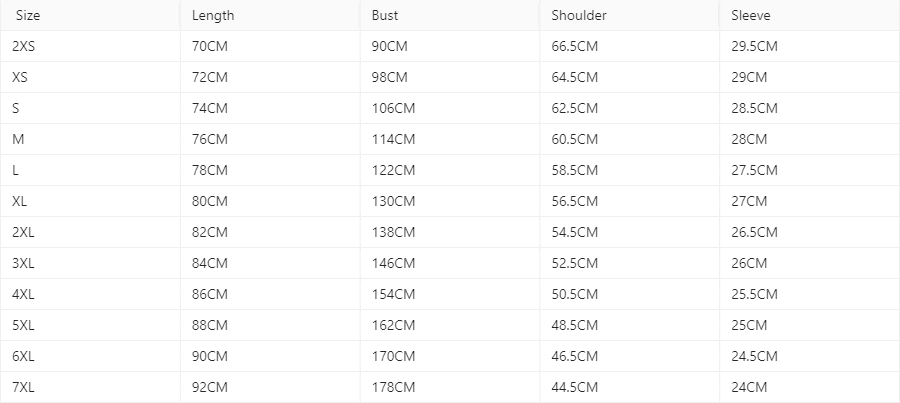 Size: XXS,XS,S,M,L,XL,2XL,3XL,4XL,5XL,6XL,7XL