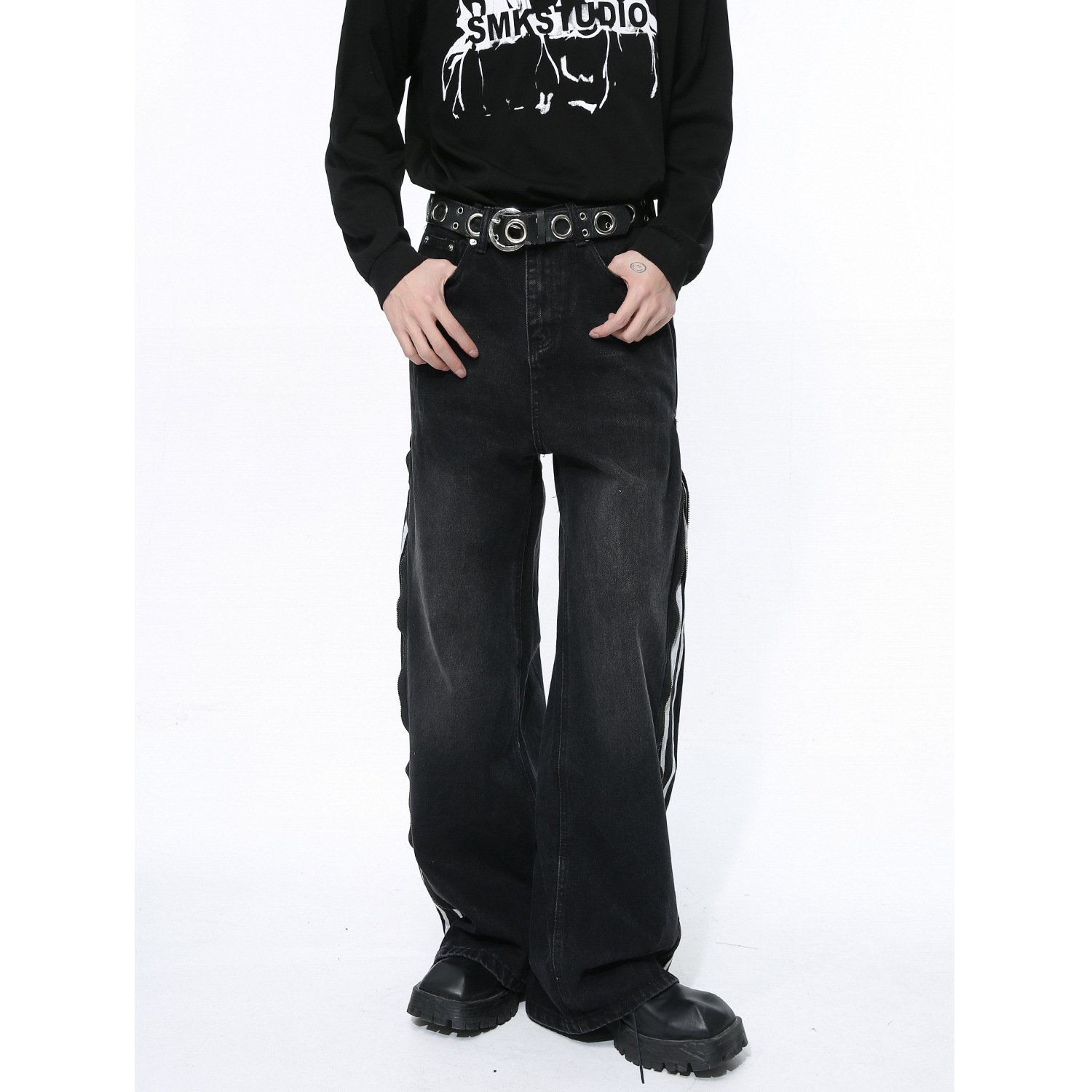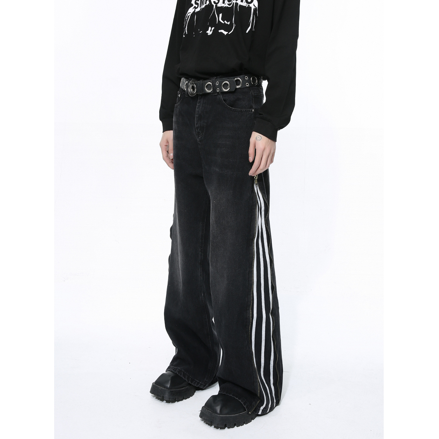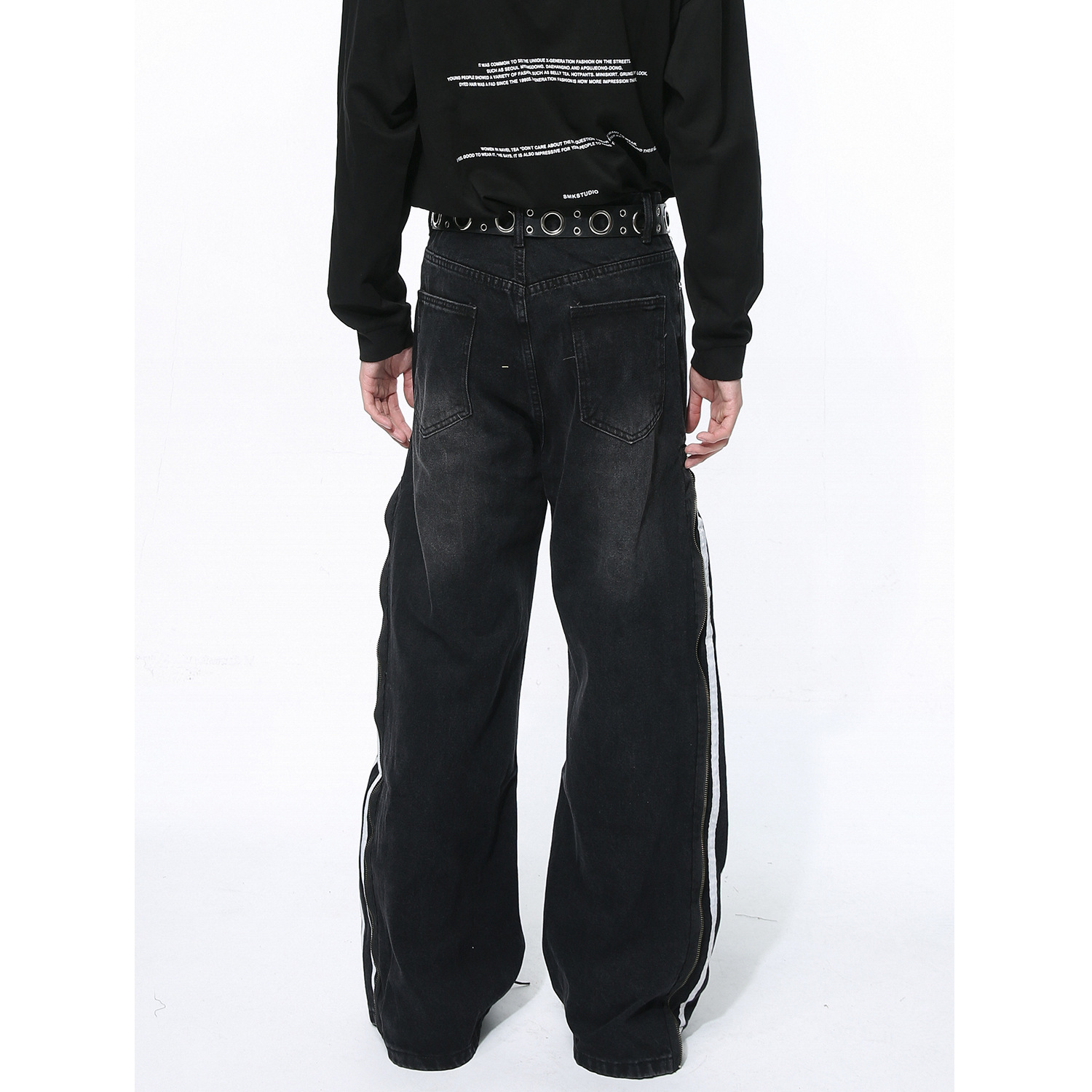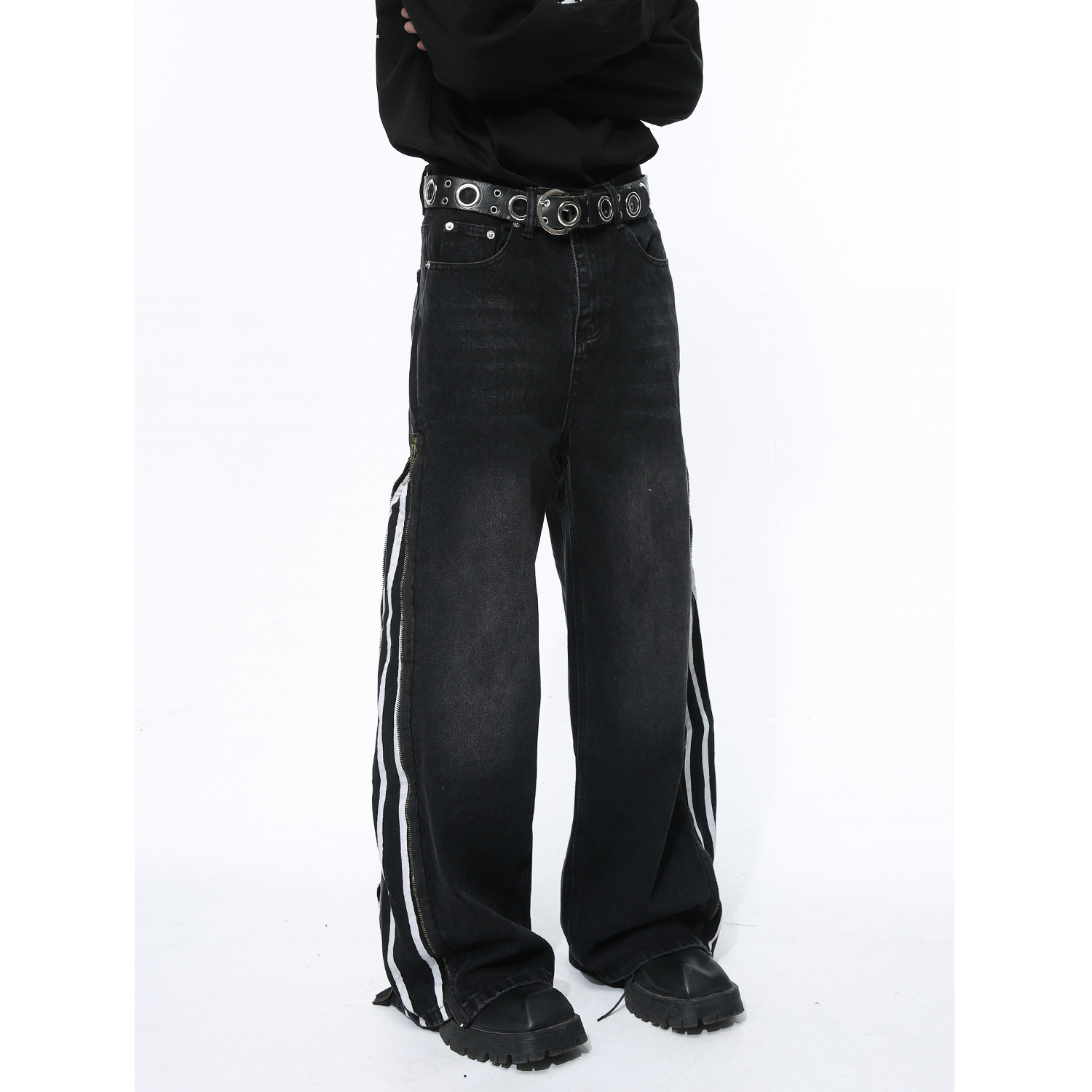Men's Side Zipper Striped Straight Loose Jeans