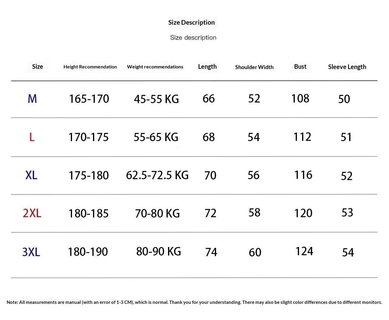 Sizes: M, L, XL, 2XL, 3XL